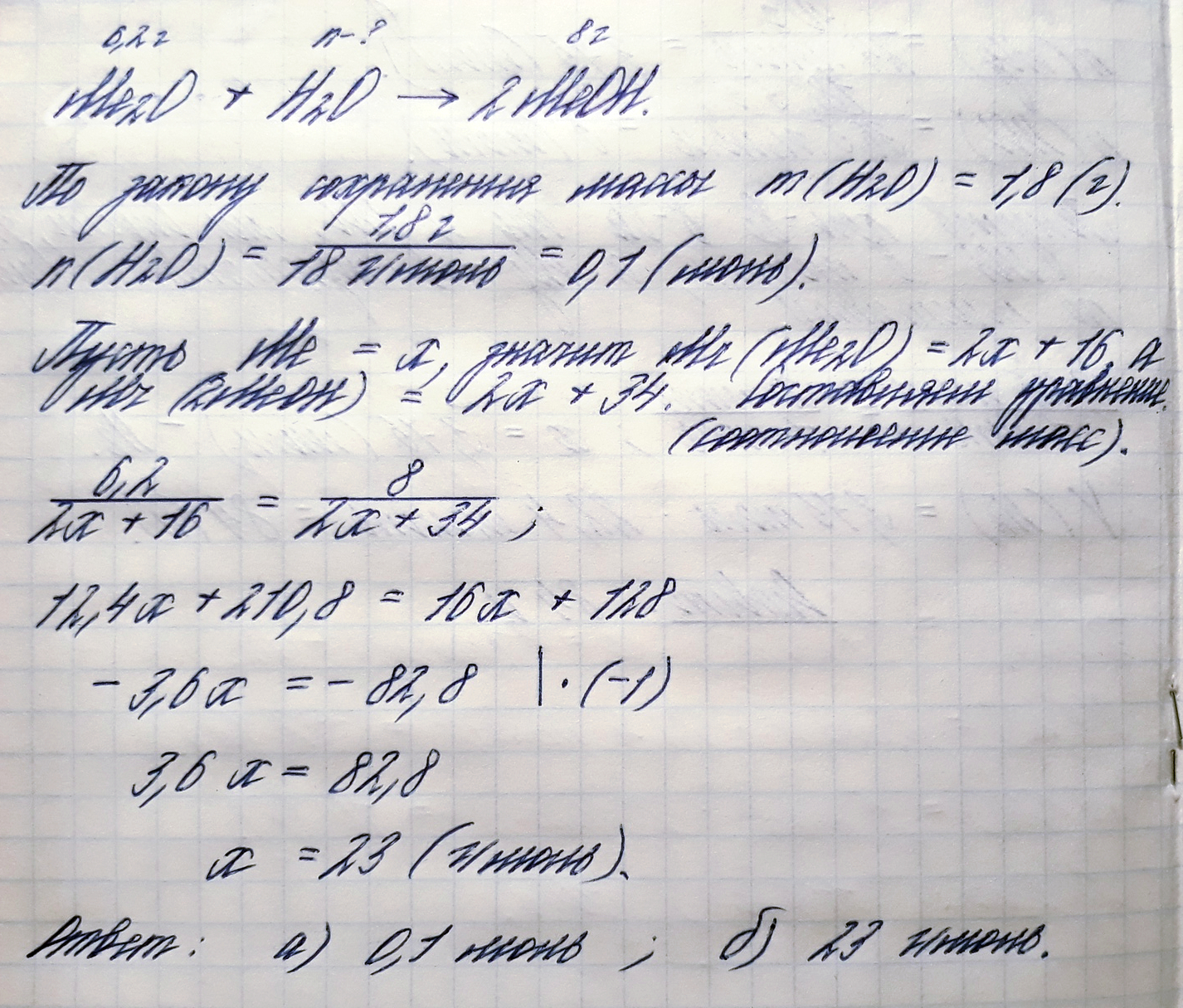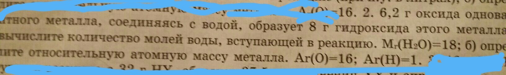 6,2 оксида одновалентного металла, соединяясь с водой, образует 8 г гидроксида этого металла. а) Вычислите количество молей воды, вступающей в реакцию. Mr(H₂O) = 18; б) определите относительную атомную массу металла.