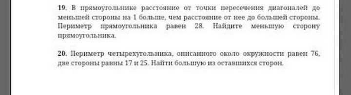 19)Пусть расстояние от точки пересечения диагоналей до большей стороны х, тогда до меньшей -( х + 1) , а эти расстояния в 2 раза меньше сторон прямо угольник.