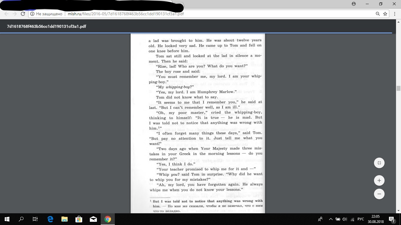 к нему привели мальчика. Ему было около двенадцати лет . Он выглядел очень грустным. Он подошел к тому и упал на одно колено перед ним. Том сидел неподвижно и минуту молча смотрел на мальчика. Тогда он сказал: "Встань, парень! Кто ты такой? Что тебе надо?" Мальчик встал и сказал: - Вы должны помнить меня, милорд. Я твой хлыст... пинг-бой." *Мой мальчик для битья?" - Да, милорд. Я Хамфри Марлоу."011 Том не знал, что сказать. "Мне кажется, что я помню тебя", - сказал он в последний. "Но я не могу хорошо вспомнить, так как я болен. - Ах, мой бедный господин! - воскликнул мальчик-битье. думая про себя: "это правда он сумасшедший. Но Мне сказали не замечать, что что-то не так его.1" - В наши дни я часто забываю многие вещи, - сказал Том. "Но не обращайте на это внимания. Просто скажи мне, что ты хочу!" "Два дня назад, когда Ваше Величество допустил три ошибки... принимает в греческом языке в утренние уроки-вы помнишь это?" "Да, я думаю, что знаю." "Твой учитель обещал выпороть меня за это и ... "Выпороть тебя? сказал Том в удивлении. "Почему он хотел Сечь тебя за мои ошибки?" - Ах, мой господин, вы опять забыли. Он всегда хлещет меня, когда ты не знаешь своих уроков. P.S. Получилось чуть криво, но ты поймешь примерно суть