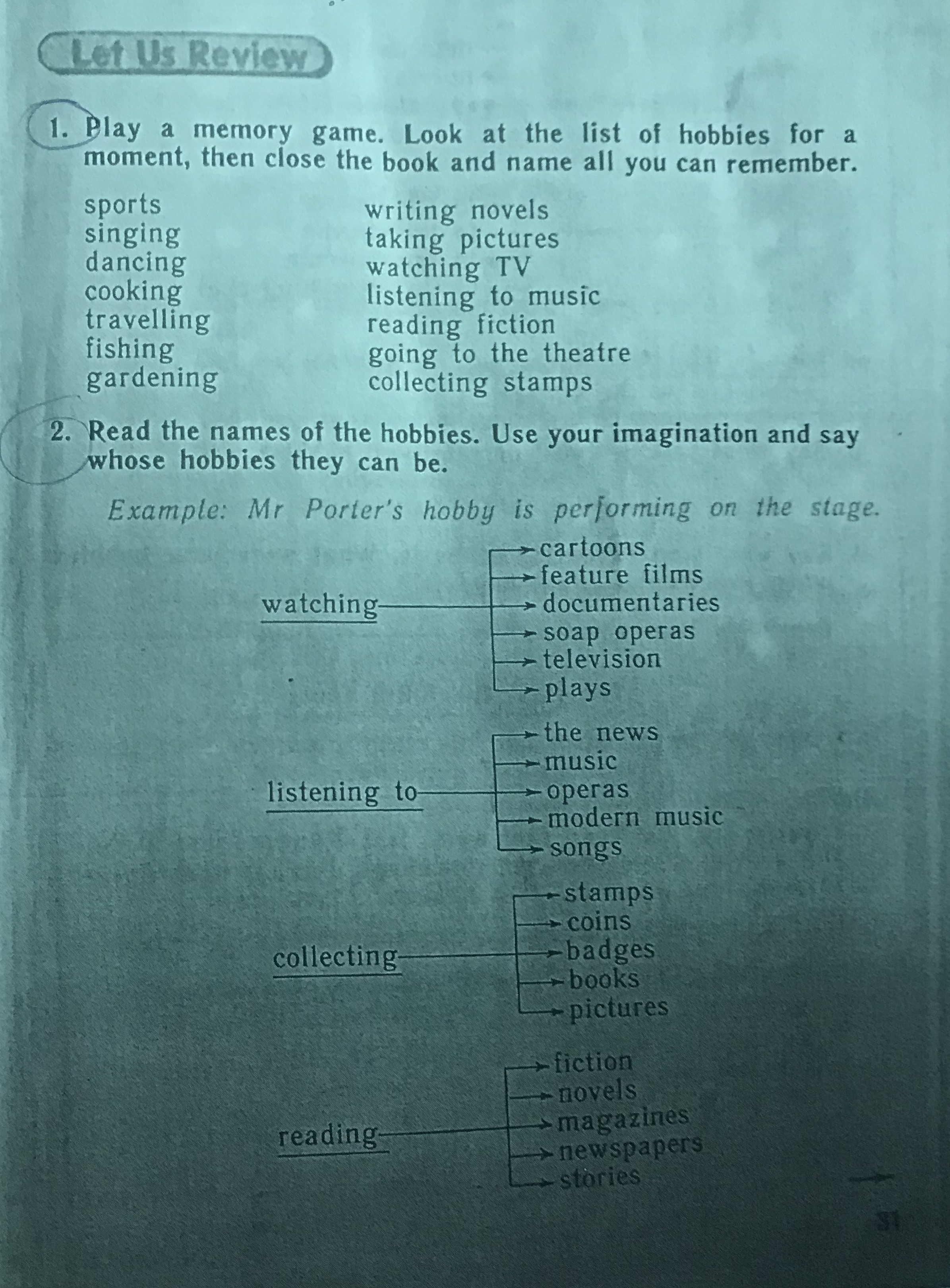 1. Тут ты должен сделать сам. Тебе нужно прочитать все хоби, закрыть их рукой и записать или перечислить все, что ты их запомнил.
