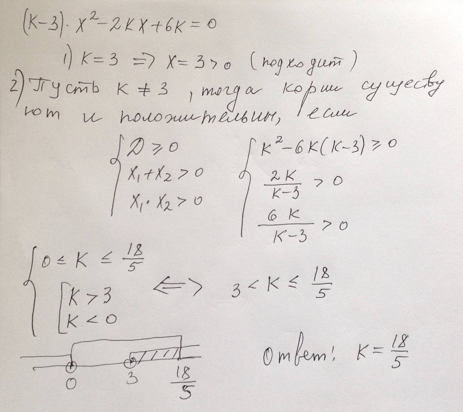 2)Найти наибольшее значение k, при котором корни уравнения существуют и положительны: (k-3)x^2 - 2kx +6k = 0.