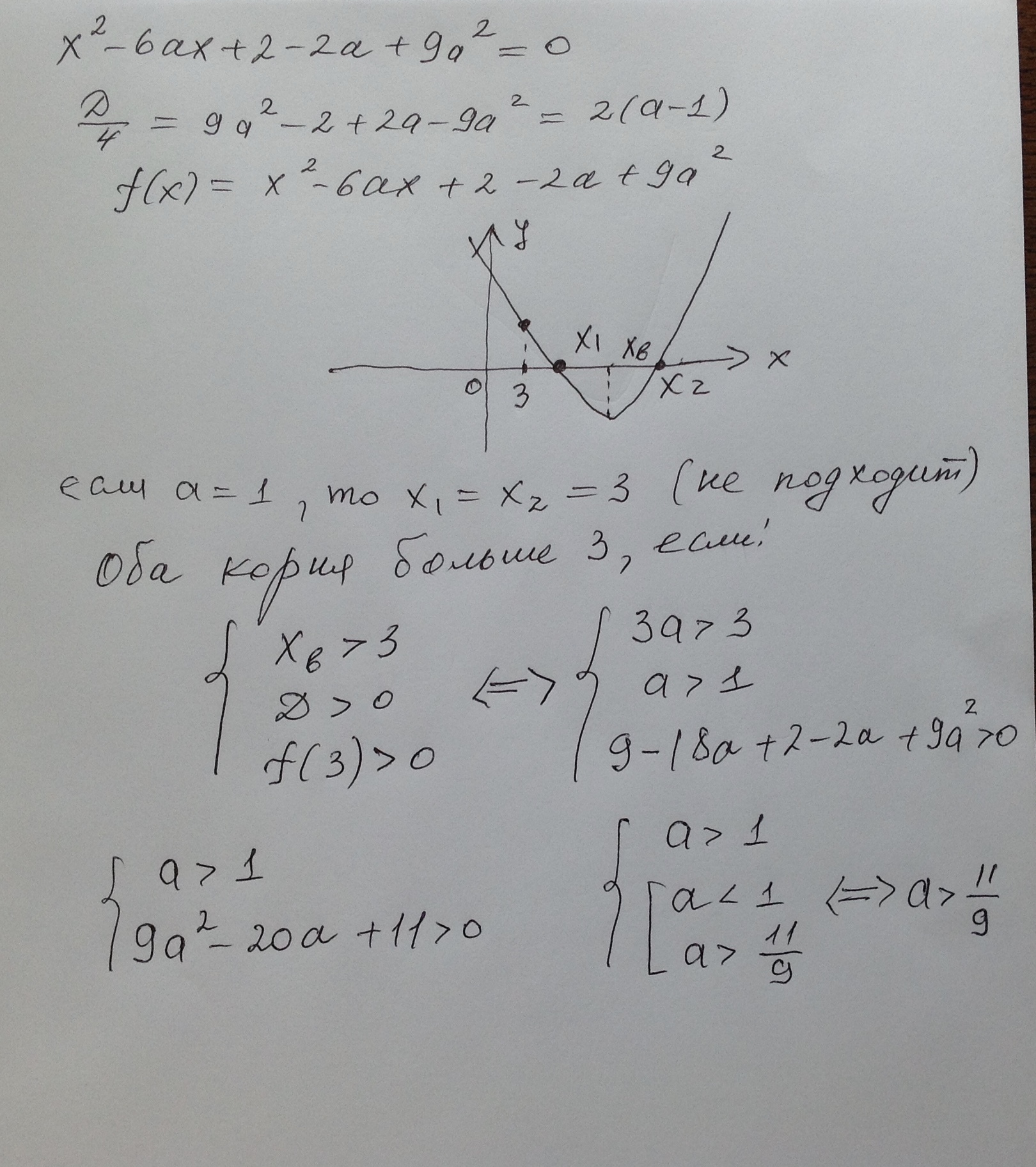 1)При каких значениях а оба корня уравнения x^2 - 6ax + 2 -2a +9a^2 = 0 больше 3-x?