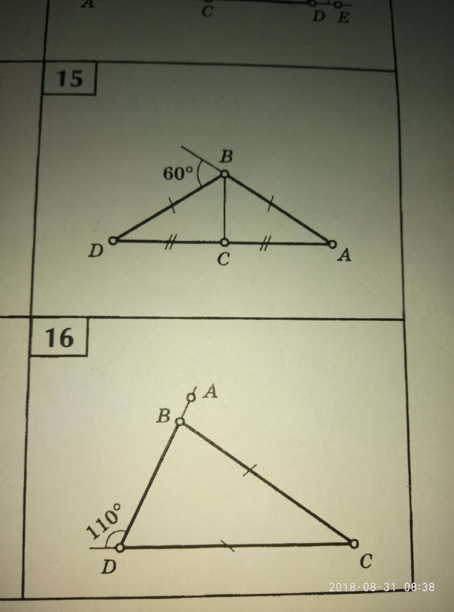 15)Это равнобедренный треугольник. Если внешний угол равен 60, значит внутренний равен 120. так как DB=BA значит BC бисектриса угла В, тогда внутрений угол делиться пополам 120:60=60