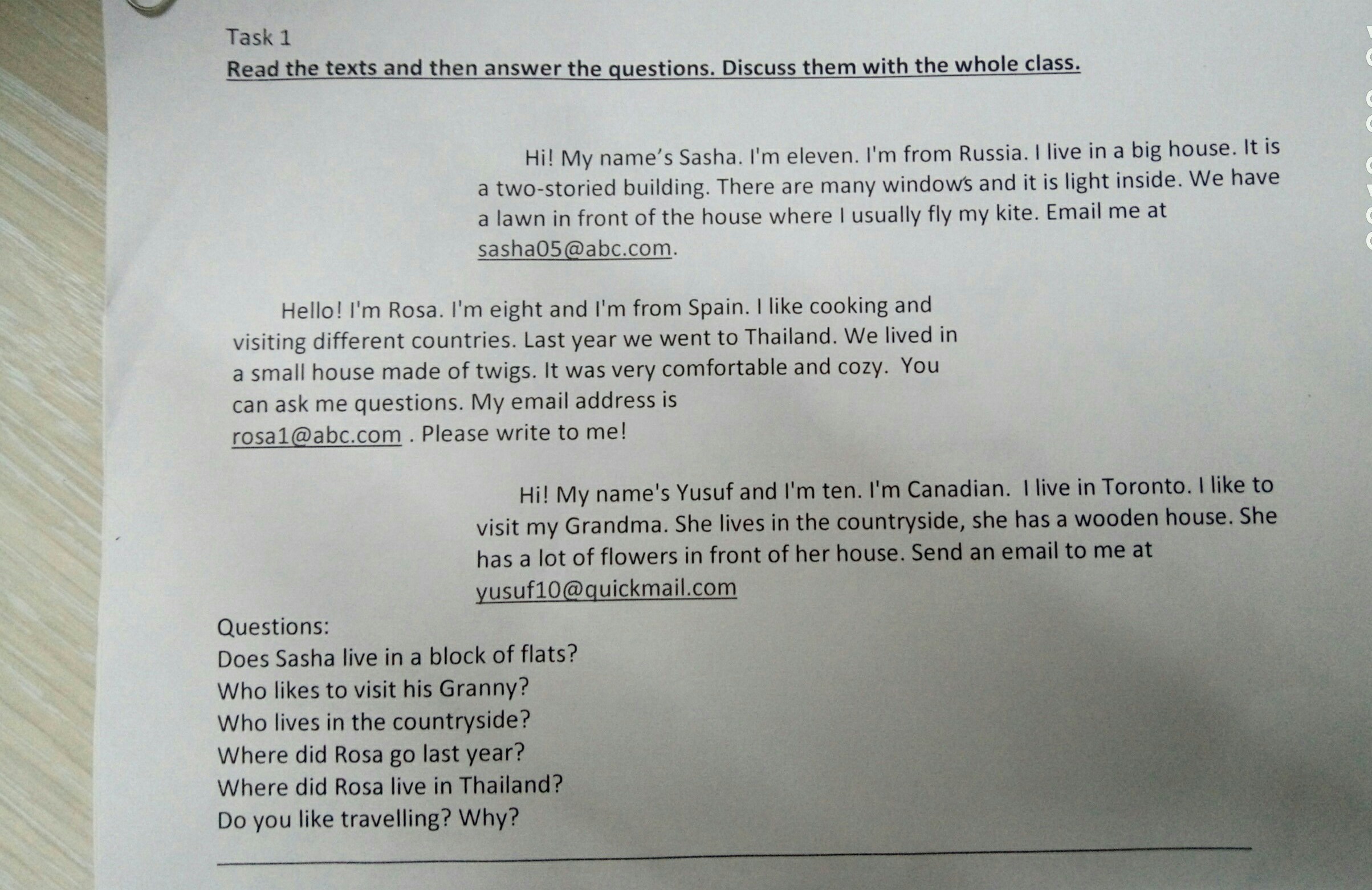 Привет! Я Роза. Мне 8 и я из Испании. Я люблю готовить и посещать разнаы страны. В прошлом году мы ездили в Тайланд.Мы жили в небольшом домике сделанным из прутьев.Это было очень комфортно . Ты можешь задавать мне вопросы.Мой имейл rosa1@abc.com Пожалуйста напиши мне !