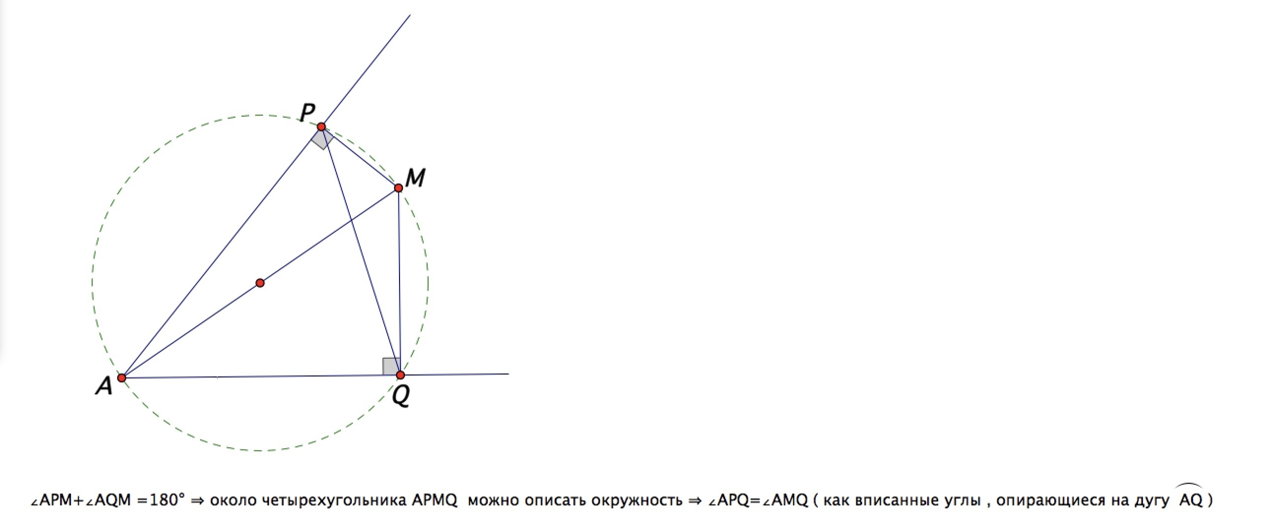 из точки м расположенной внутри острого угла с вершиной а проведены перпендикуляры мp и мq к сторонам угла докажите что угол apq= углу amq