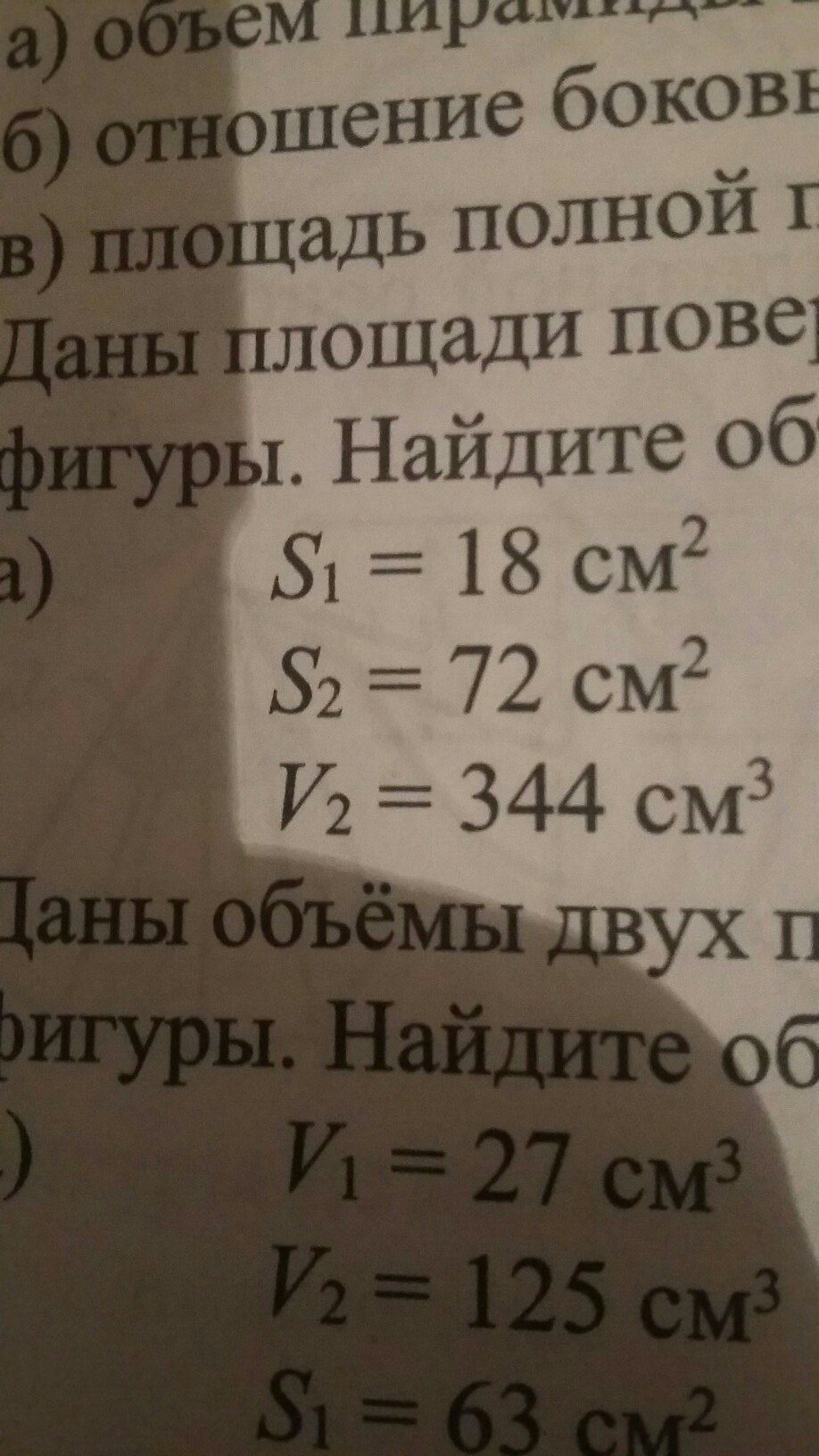 Даны площади поверхностей двух подобных фигур и объем большей фигуры. найдите объем меньшей фигуры