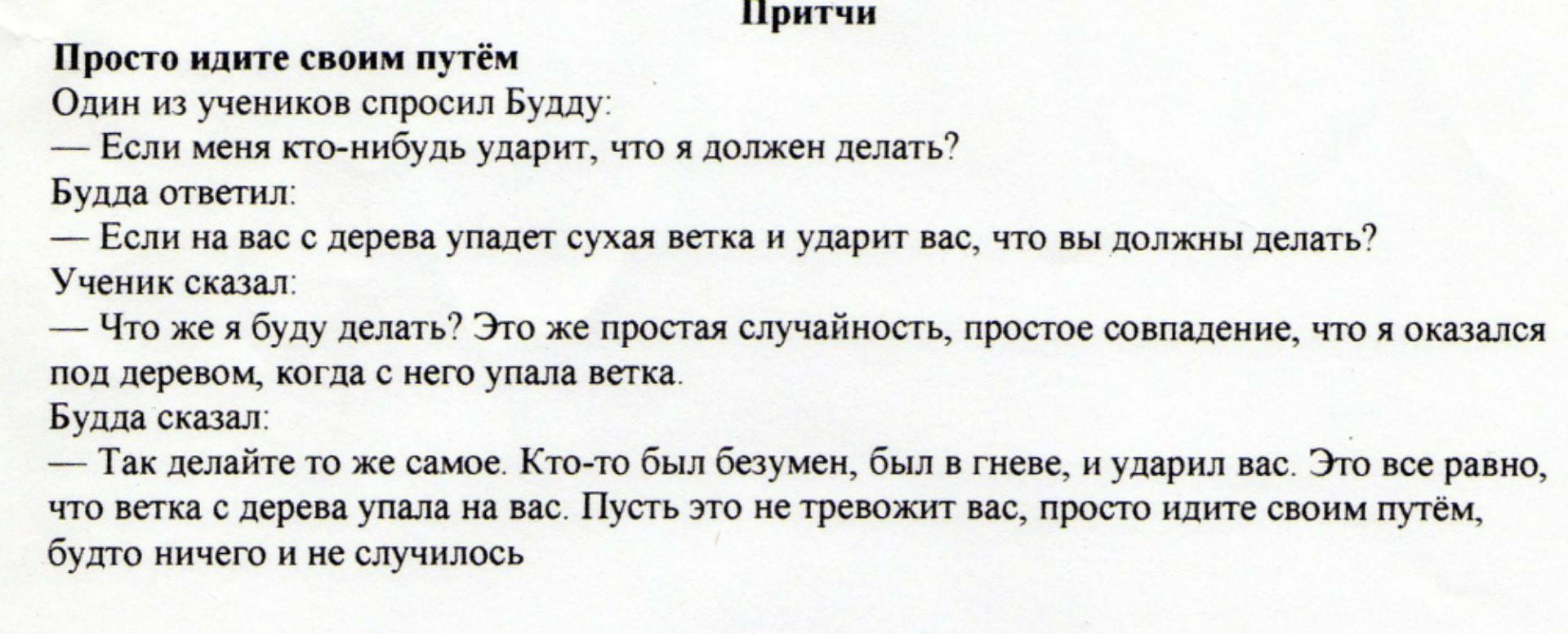 Притча учит не держать зло на людей так как это бессмысленно. Никогда в жизни драка или побои не могут ничего решить. Так же притча учит не обращать внимание на людей, которые делают зло ради развлечения. Не обращайте внимание, и тогда люди прекратят это делать.