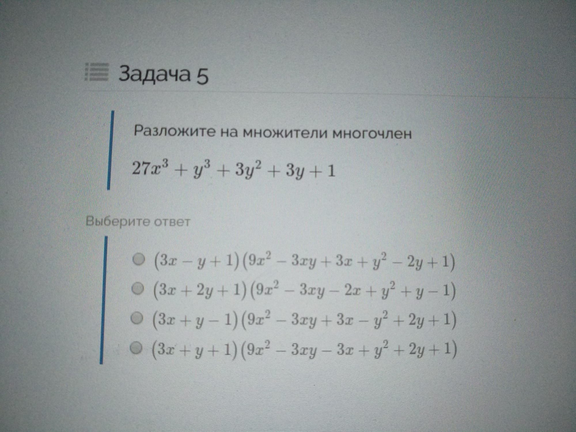 tt 27x^3+y^3+3y^2+3y+1=(3x)^3+(y+1)^3 =(3x+y+1)((3x)^2-3xcdot\ \ cdot(y+1)+(y+1)^2)=(3x+y+1)(9x^2-3xy-3x+y^2+2y+1)