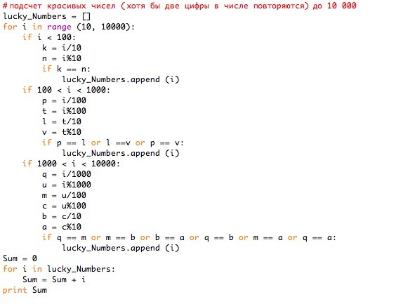 Сумма красивых чисел, меньших 100, равна 495 (11 + 22 + 33 + 44 + 55 + 66 + 77 + 88 + 99 = 495)