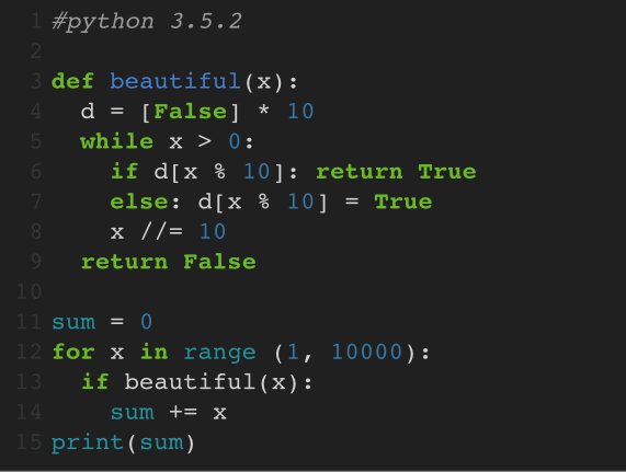 Задача: Назовём красивыми числа, в записи которых есть минимум две одинаковые цифры (например: 44, 505, 1101, 2324).