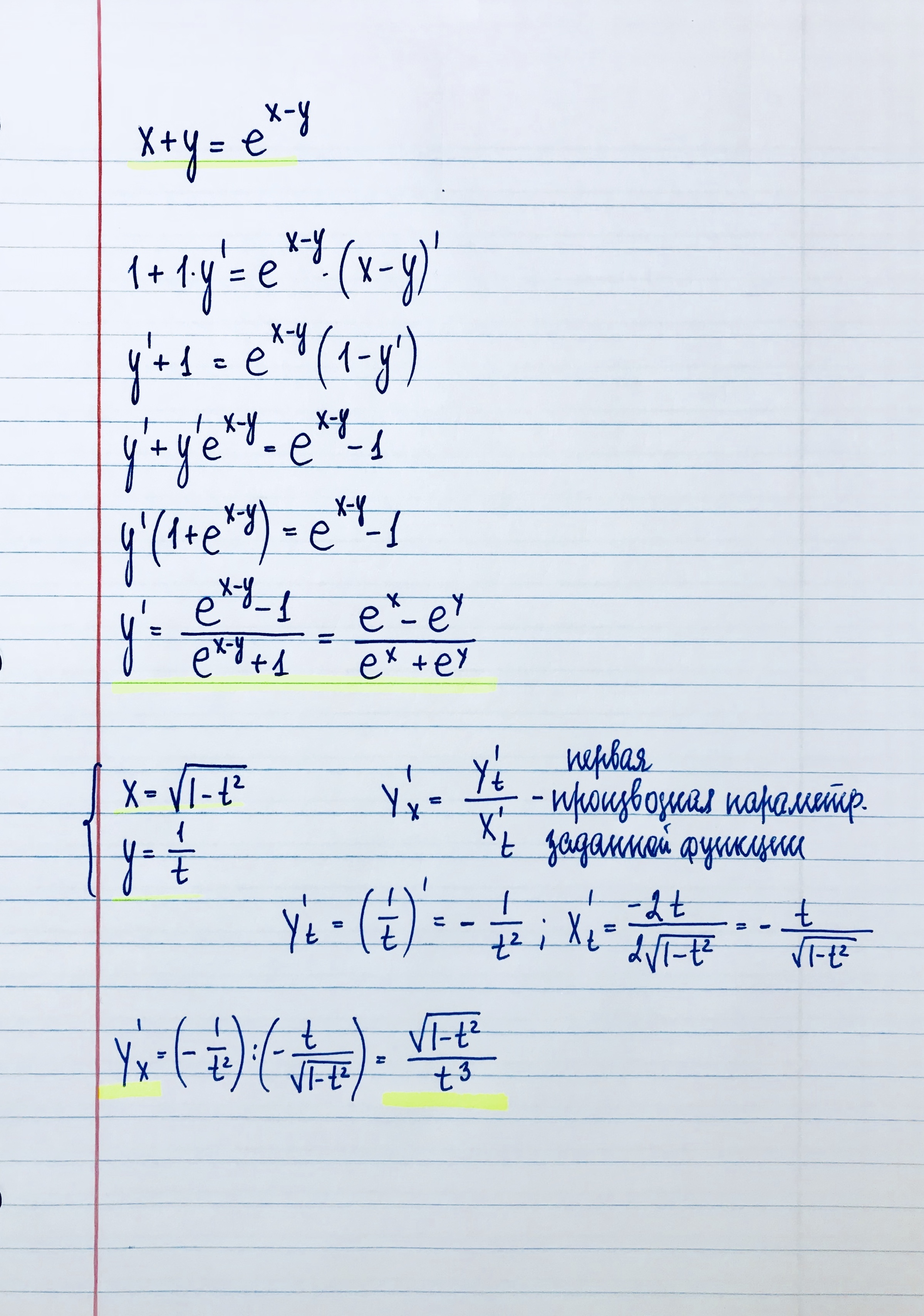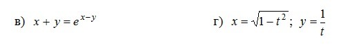 Ловите решение. Для нахождения производной в первом задании применяем правило дифференцирования неявных функций, для второго - дифференцируем как функцию, заданную параметрически.