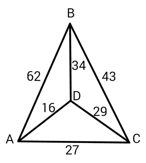 На рисунке показано расположение городов A, B, C и D и расстояния между ними. Турист выходит из города B и собирается посетить остальные города, побывав в каждом по разу.