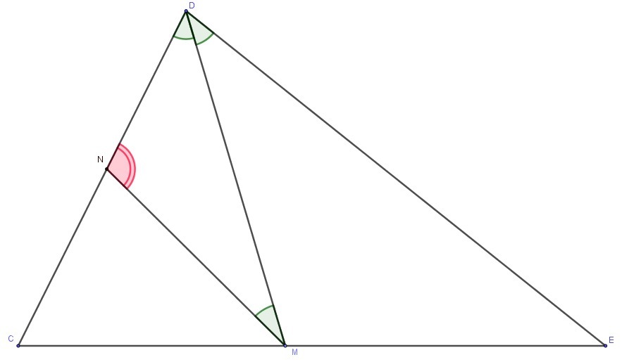 Відрізок DМ − бісектриса трикутника СDЕ. Через точку М проведено пряму, яка паралельна стороні DE і перетинає сторону DС у точці N. Знайдіть кути трикутника DMN, якщо кут CDE дорівнює 68