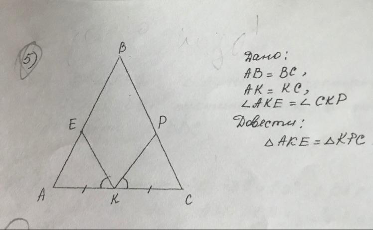1) AB=BC следовательно △ABC равнобедренный следовательно угол EAK=PCK (по свойству равнобедренного треугольника)