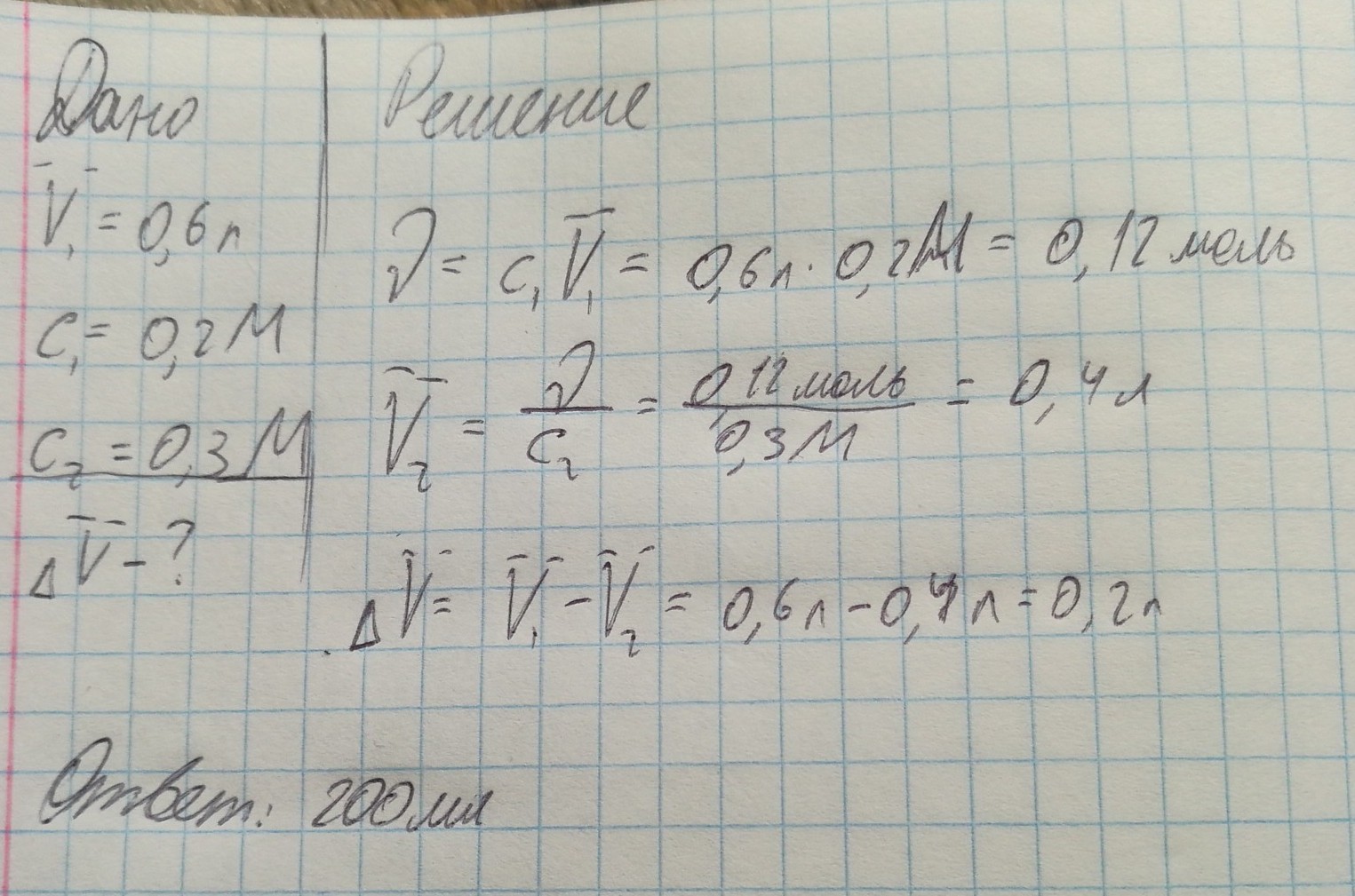 ОЧЕНЬ СРОЧНО!!!! заранее спасибо!!! Сколько мл воды необходимо выпарить из 600 мл 0,2 М раствора соли, чтобы получить 0,3 М раствора?
