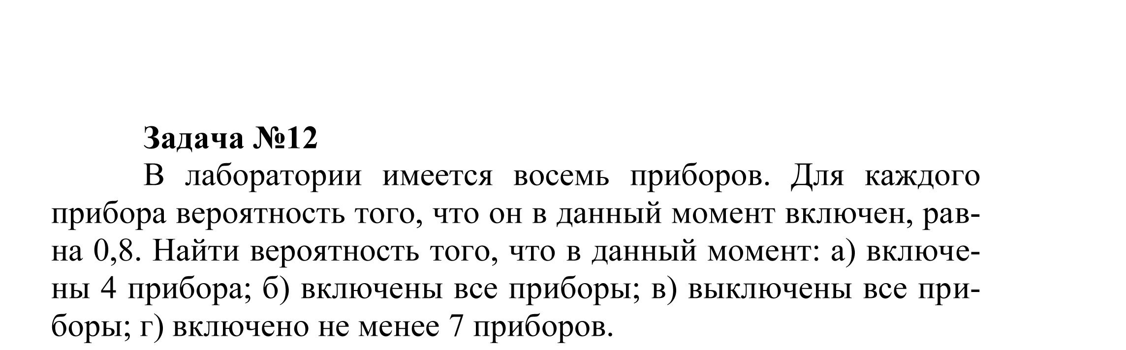 Найти вероятность того, что в данный момент: а) включены 4 прибора; б) включены все приборы; в) выключены все приборы; г) включено не менее 7 приборов.(с решением)