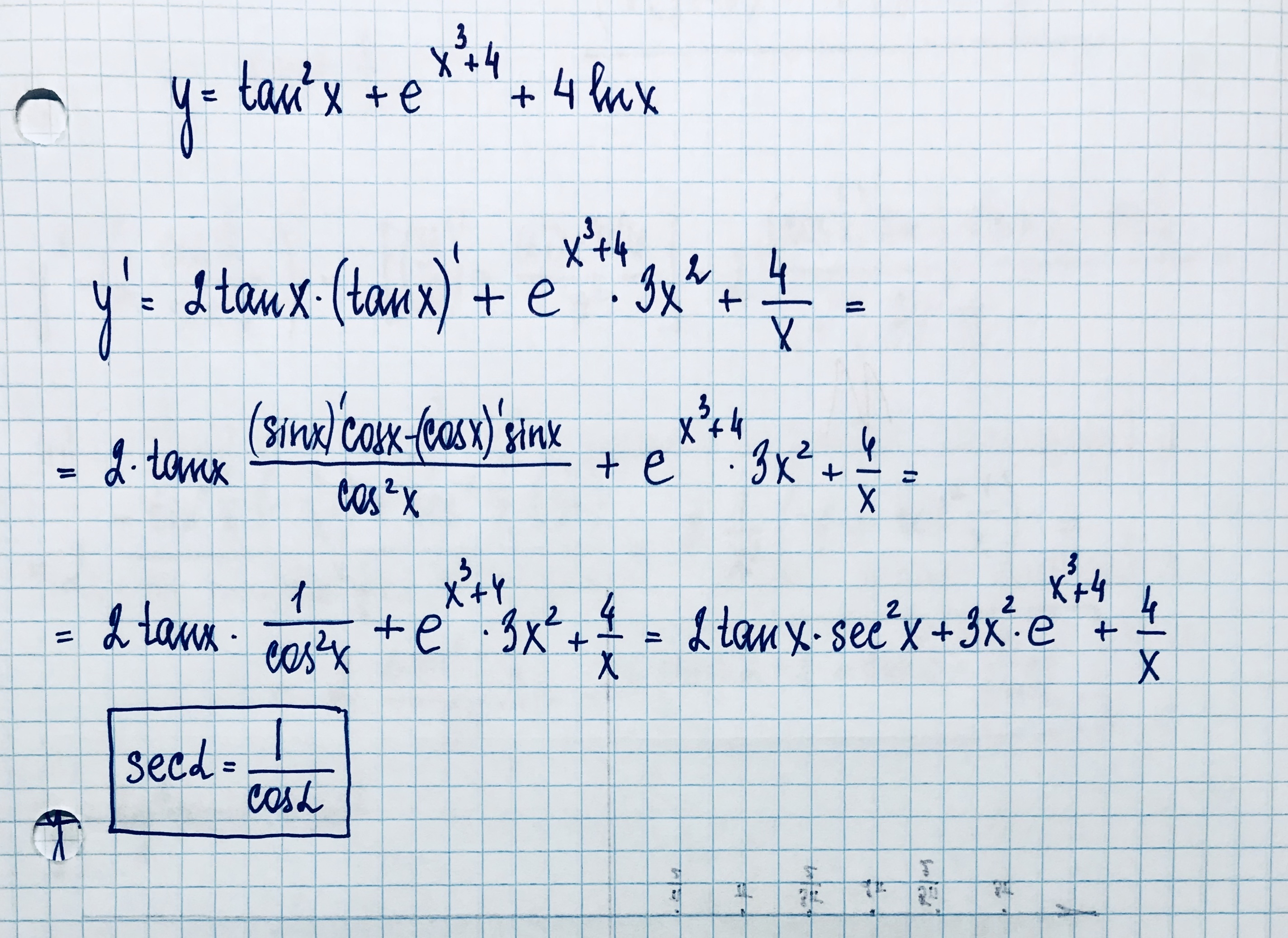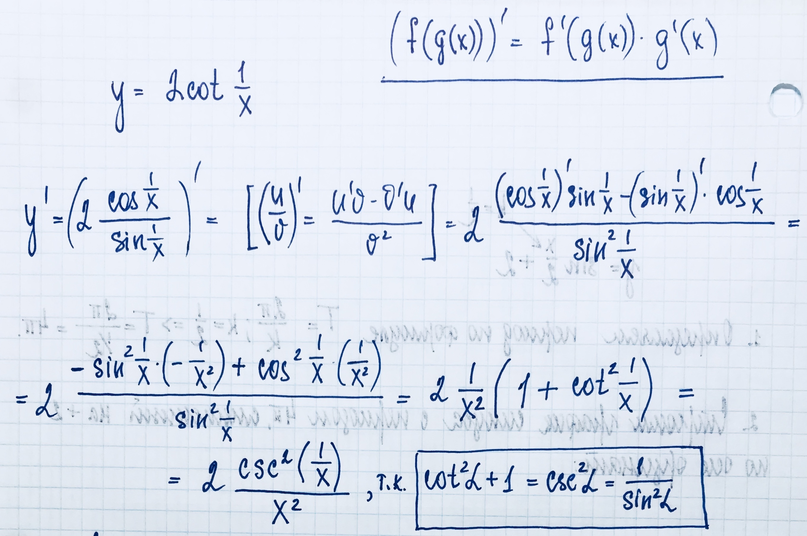 p.s. Если вам не очень комфортно опрерировать функциями секанса sec(x)= 1/cos(x) и косеканса csc(x)=1/sin(x), то не упрощайте максимально выражение производной в каждом решении, остановитесь на предпоследнем шаге в каждом из примеров.