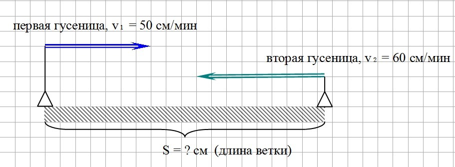27 Решите задачу ДВУМЯ способами, начертив предварительно схему. Две гусеницы ползли по ветке навстречу друг другу, одна со скоростью 50см/мин, а вторая со скоростью 1см/сек. Гусеницы встретились через 2 мин. Какова длина ветки?