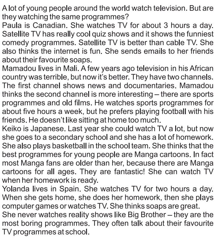 Мамаду живёт в Мали. Несколько лет назад телевидение в их африканской стране было ужасным, теперь оно лучше. У них есть 2 канала. Первый канал показывает новости и документальные фильмы. Мамаду думает что второй канал интереснее, так как там показывают старые фильмы и спортивные программы. Он смотрит спортивные программы около 5 часов в неделю, и он предпочитает играть в футбол со своими друзьями. Он не любит сидеть дома слишком много.
