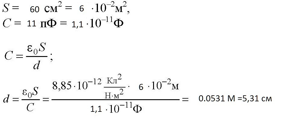 Площадь каждой пластины плоского воздушного конденсатора равна 60см2. На каком расстоянии находятся пластины конденсатора, если его емкость составляет 11пФ?