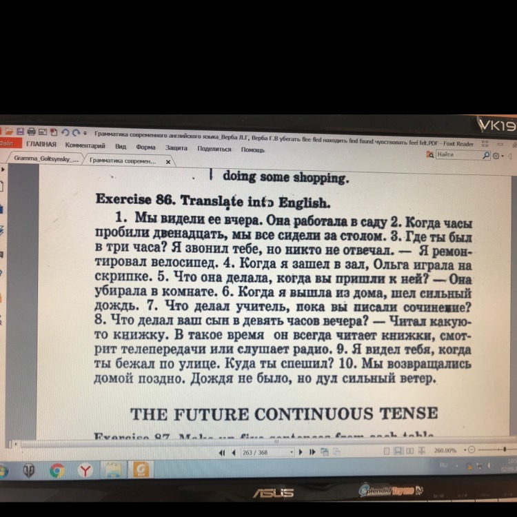 1. We saw her yesterday. She worked in the garden. 2. When the clock was twelve, we all were sitting at the table. 3. Where were you at three o'clock? I phoned you, but nobody answered. - I was repairing a bicycle. 4. When I entered the hall, Olga was playing the violin. 5. What was she doing, when you came to her? - She was cleaning the room. 6. When I went out of home, it was strongly raining. 7. What did the teacher do while you were writing the composition? 8. What did your son do at ten o'clock? - He was reading a book. At that time he always reads books, watches TV or listens to radio. 9. I saw you, when you were running the street. Where did you hurry? 10. We were comming home late. It wasn't raining, but it was strongly windy.