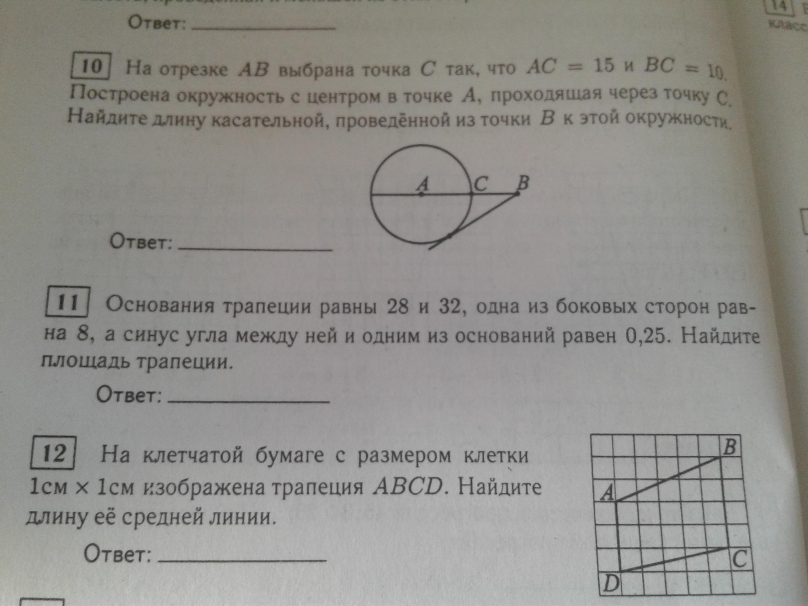 11. Основания трапеции равны 28 и 32, одна из боковых сторон равна 8, а синус угла между ней и одним из оснований равен 0,25. Найдите площадь трапеции.