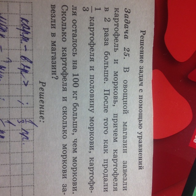 По условию, картофеля осталось на 100 кг больше, чем моркови.