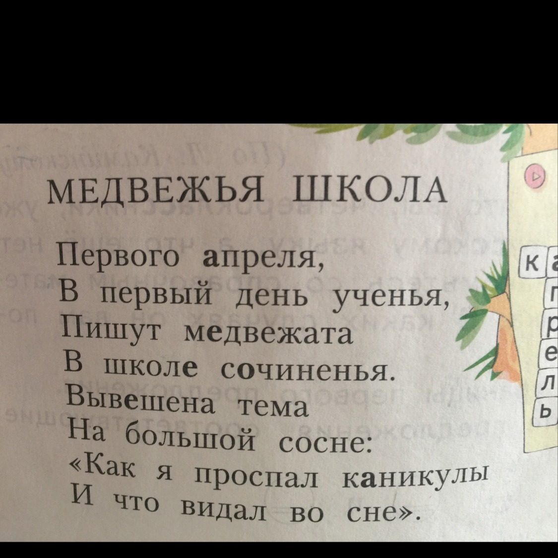 Первого апреля, В первый день ученья, Пишут медвежата В школе сочиненья. Вывешена тема На большой сосне: «КАК Я ПРОСПАЛ КАНИКУЛЫ И ЧТО ВИДАЛ ВО СНЕ».