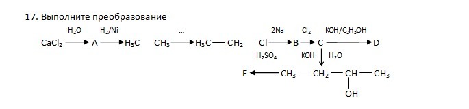 Отпечатка, они имеют в виду CaC2, а не CaCl2. A = ацетилен, C2H2 Многоточие = Cl2, hv B= бутан, CH3-CH2-CH2-CH3 C= 2-хлорбутан, CH3-CH(Cl)-CH2-CH3 D=бутен-2, CH3-CH=CH-CH3 Е=ди-втор-бутиловый эфир, (H3C-H2C-(CH3)СH)2O Удачи вам!