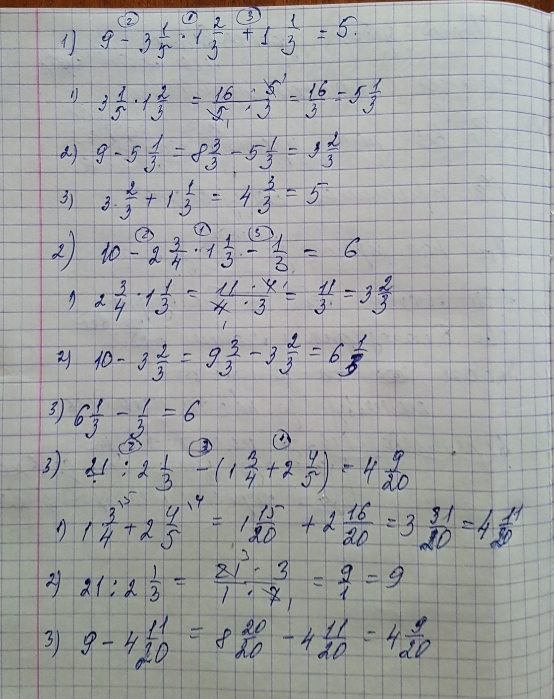 3) 21:2 1/3 - (1 3/4 + 2 4/5)