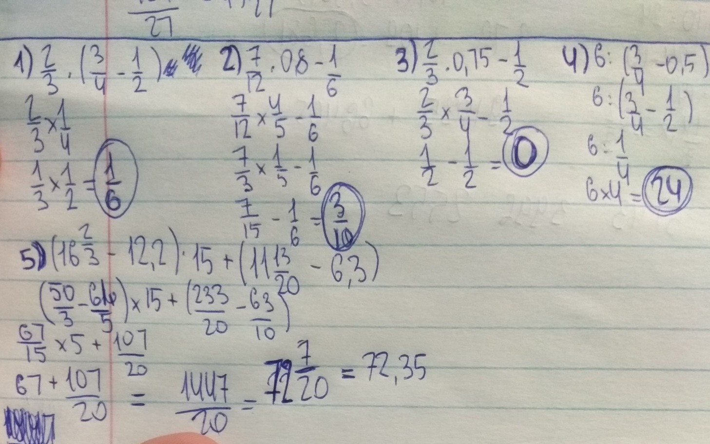 1)2/3×(3/4-1/2)=, 2)7/12×0,8-1/6=, 3)2/3×0,75-1/2=, 4)6÷(3/4-0,5)=, 5)(16 2/3-12,2)×15+(11 13/20-6,3)=.