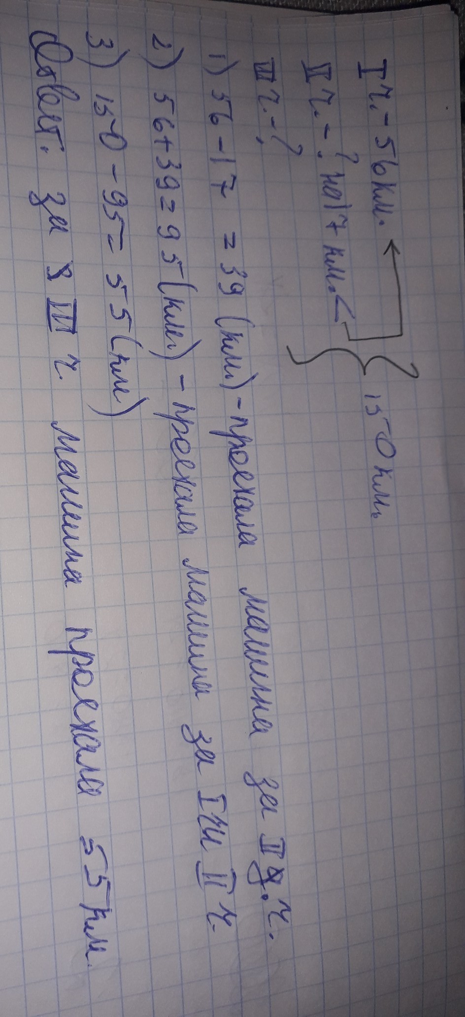 За 3 ч автомашина прошла 150 км.В первый час она прошла 56 км,а во второй на 17 км меньше чем в первый.Сколько километров прошла автомашина за третий час? Решите пожалуйсто задачку*Заранее спасибо*УСЛОВИЕ