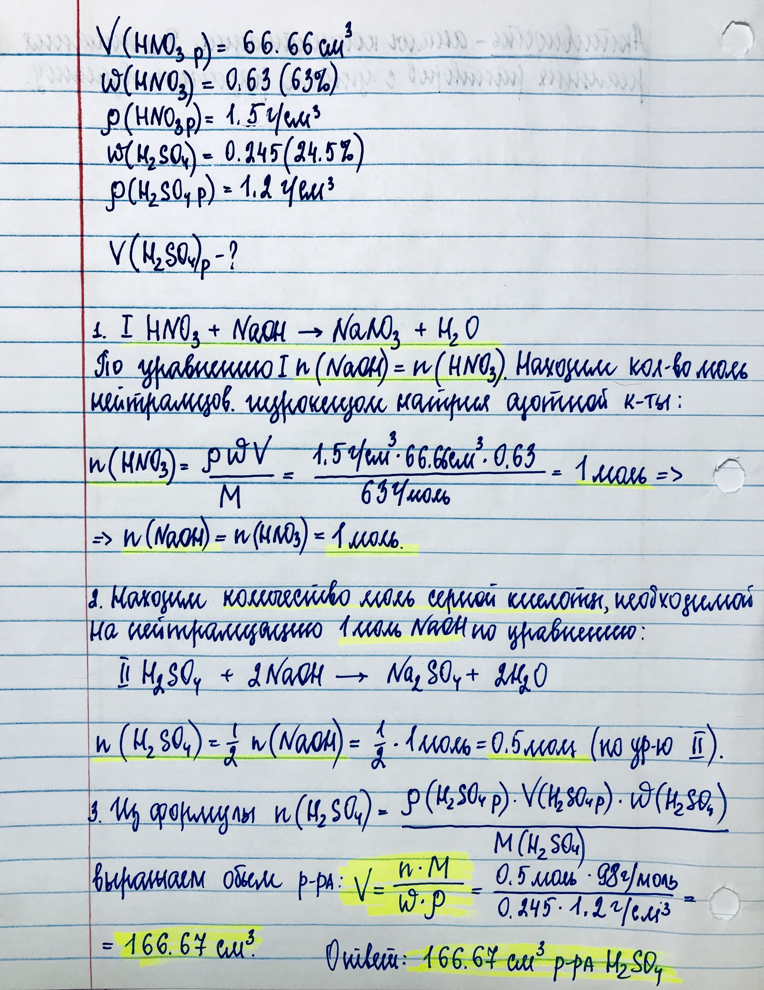 Для нейтрализации раствора NaOH израсходовано 66.66 см3 раствора HNO3 (w=63%,p=1.5 г/см3) Какой объем раствора серной кислоты (w=24.5%,p=1.2) потребуется для нейтрализации того же количества щелочи? Если можно, то объясните ход решения