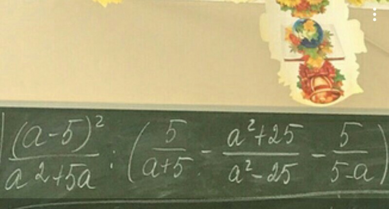 frac{(a - 5)^2}{a^2 + 5a} : left( frac{5}{a + 5} - frac{a^2 + 25}{a^2 - 25} - frac{5}{5 - a} right) = frac{(a - 5)^2}{a(a + 5)} : left( frac{5}{a + 5} - frac{a^2 + 25}{(a - 5)(a + 5)} + frac{5}{a - 5} right) = frac{(a - 5)^2}{a(a + 5)} : left( frac{5a - 25 - a^2 - 25 + 5a + 25}{(a - 5)(a + 5)} right) = frac{(a - 5)^2}{a(a + 5)} : left(-frac{a^2 - 10a + 25}{(a - 5)(a + 5)} right) = - frac{(a - 5)^2 (a - 5)(a + 5)}{a(a + 5)(a - 5)^2} = -frac{a - 5}{a}