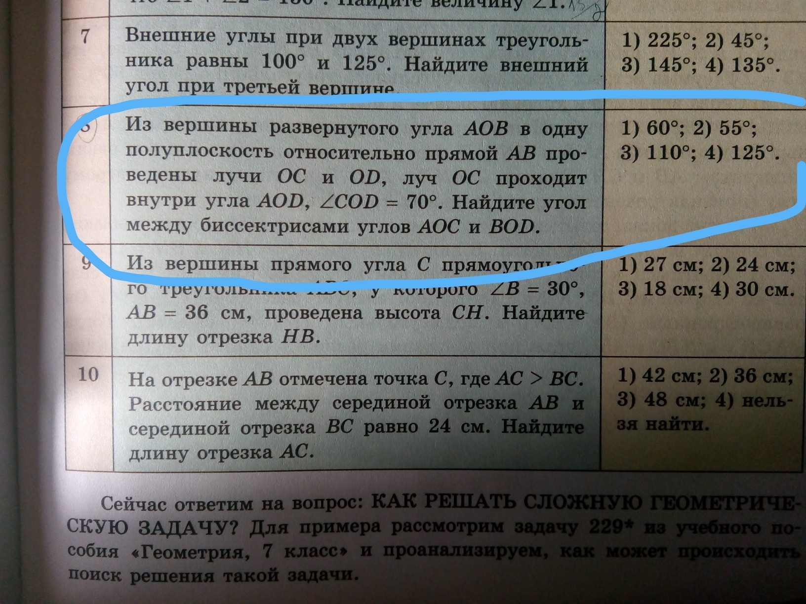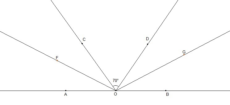Сумма углов AOC и BOD равна 180-70=110 градусов. Тогда сумма углов FOC и DOG (поскольку OF и OG - биссектрисы) равна 110:2=55 градусов и по-этому угол FOG равен 70+55=125 градусов.