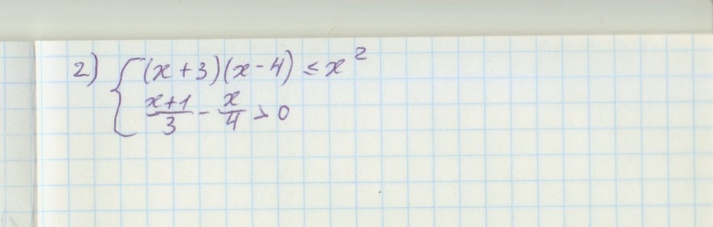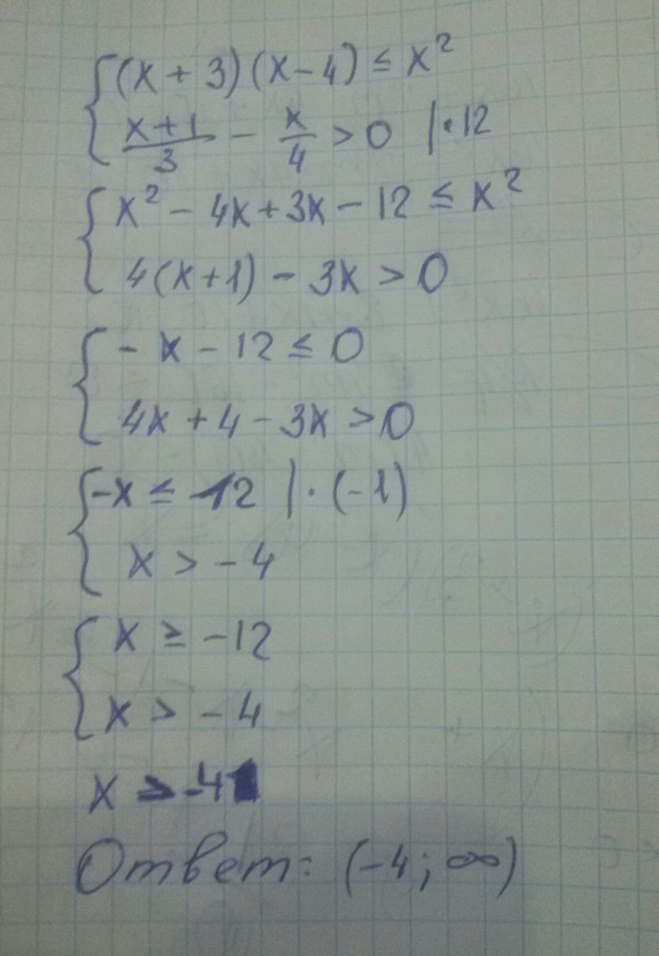 { (x+3)(x-4) ≤ x² ; (x+1)/3 -x/4 >0 .⇔ { x² - 4x +3x -12 ≤ x² ; (4x+4 -3x) /12> 0. ⇔