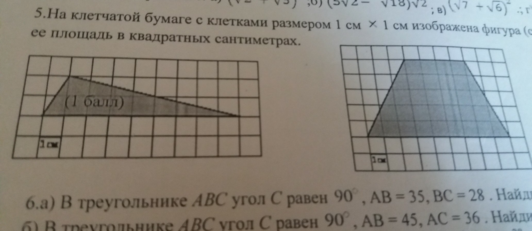 на клетчатой бумаге с клетками размером 1см х 1см изображена фигура .найдите ее площадь в квадратных см
