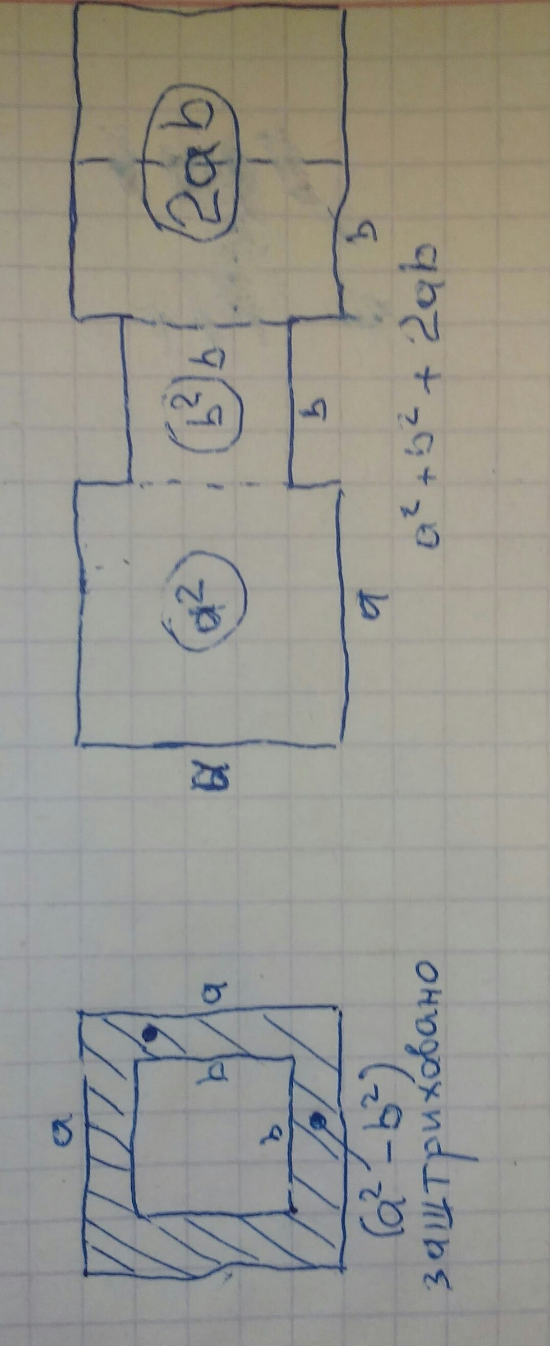 1) (a-b)(a+b)= a²-b² разность площадей двух квадратов- прямоугольников с равными сторонами а и b 2) =a²±2ab+b² - сумма площадей двух квадратов со сторонами a и b, и удвоенная сумма- разность площади прямоугольника со сторонами a и b