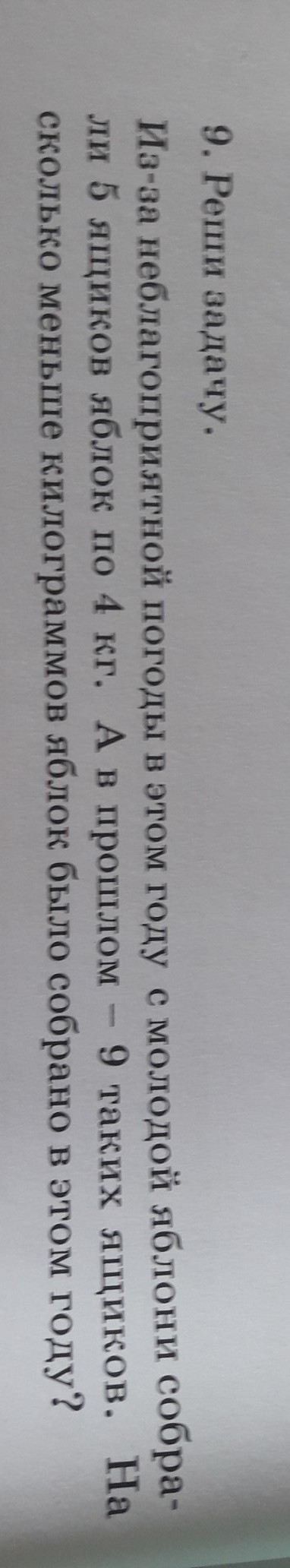 из за неблагоприятной погоды погоды в этом году с молодой яблони собрали 5 ящиков яблок по 4 кг. А в прошлом -9 таких ящиков.На сколько меньше килограммов яблок было собранно в этом году? нужно условие задачи пожалуйста обязательно
