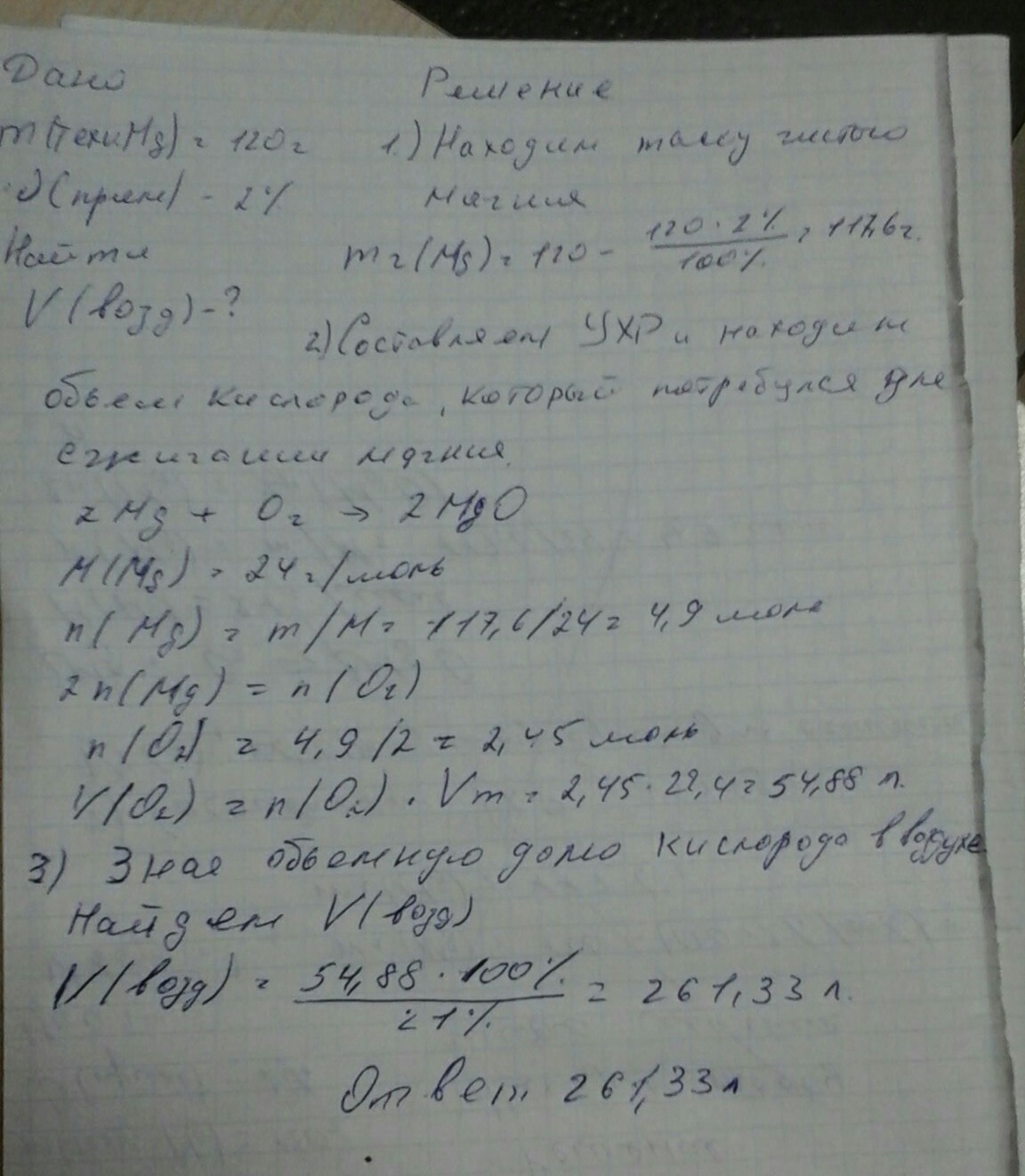 Вычислите объем воздуха (примите объемную долю кислорода в нем равной 0,2), который потребуется для сжигания 120 г образца магния, содержащего 2% негорючих примесей