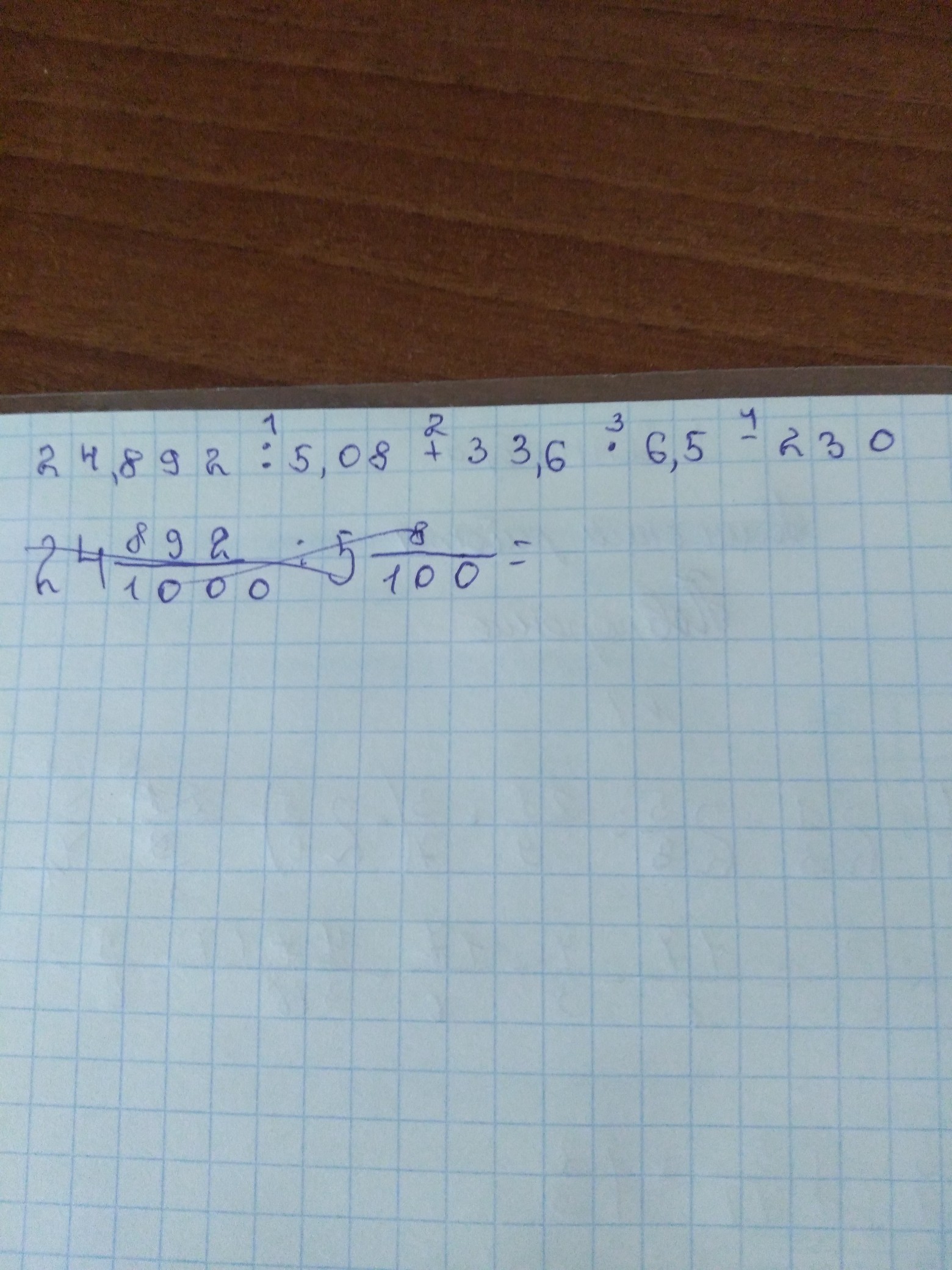 Действия выполнять в таком порядке 1 -3 -2-4 1) 24892/1000:5080/1000= 24892:5080= 4.9 3) =218.4 2) =223.3 4) =223.3-230= -6.7