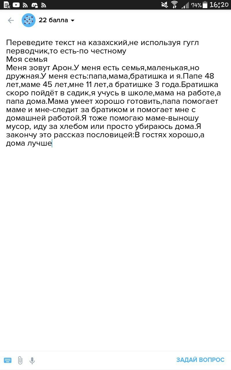 менің атым Арон. менің отбасым кішкентай болғанымен тату тəтті. менің отбасымда анам əкем інім жəне мен. Əкем 48 жаста анам 45 жаста мен 11демін інім 3те. інім жақында балабақшаға барады,мен мектепте оқимын анам жұмыс істейді, əкем болса үйде