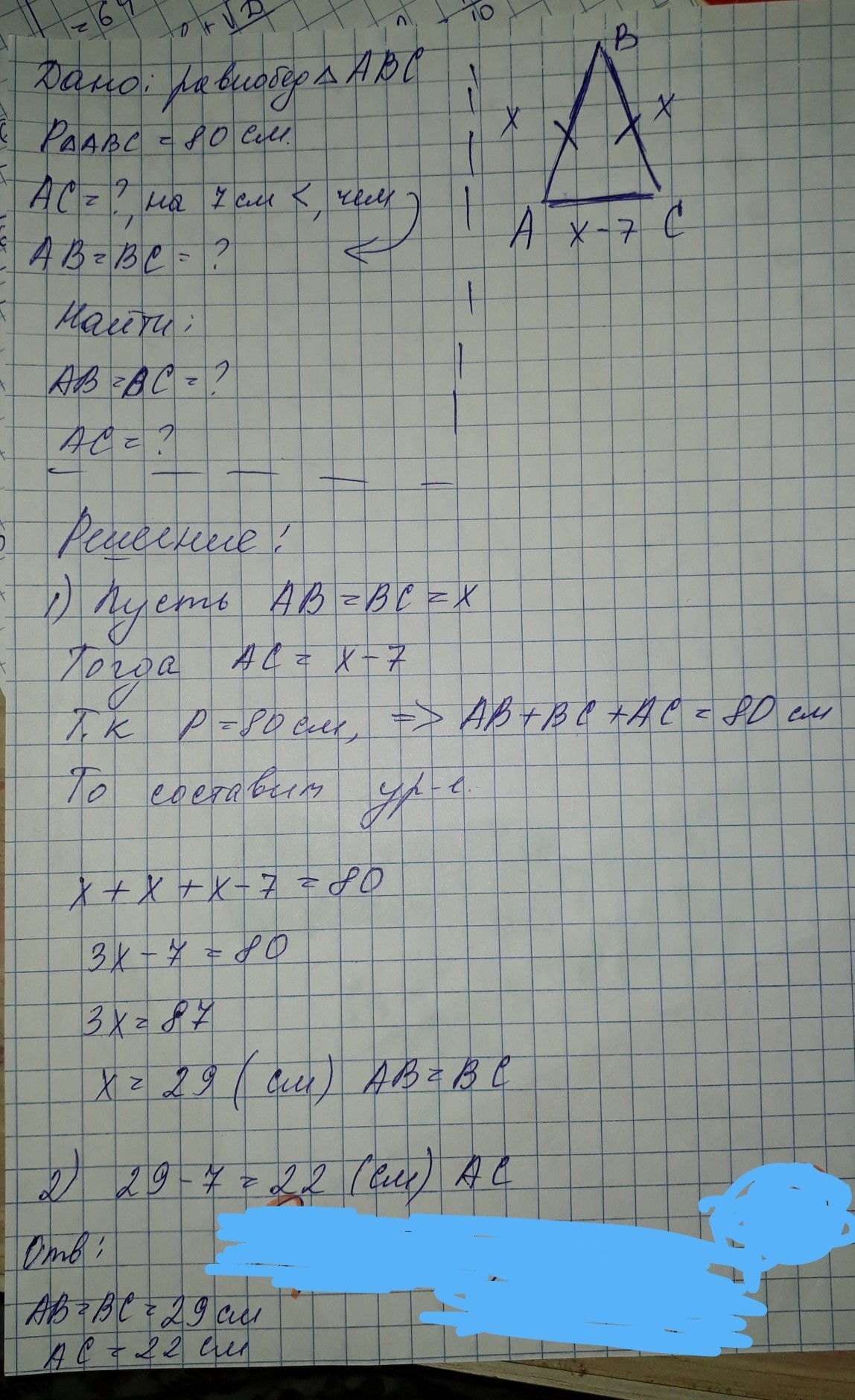 периметр равнобедренного треугольника равен 80 см. Основание меньше боковой стороны на 7 см. Найдите стороны этого треугольника