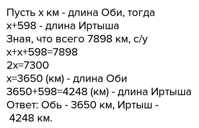Система { И - О = 598 { И + О = 7898 Чтобы найти длину более короткой реки Оби, нужно из суммы вычесть разность и разделить на 2 О = (7898-598)/2 = 7300/2 = 3650 км. И = О + 598 = 3650 + 598 = 4248 км. Длина Оби 3650 км, длина Иртыша 4248 км.