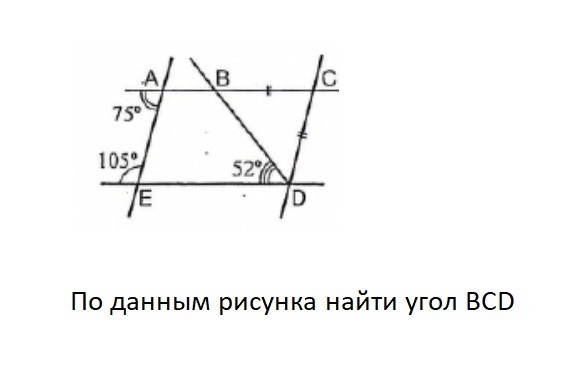 Прямые у нас параллельны, т.к. смежные углы равны (180-105)=75; (180-75)=105. Значит у нас тоапеция. Сумма углов трапеции равна 360 Три угла у нас есть: смежные со 105 и 75 равны соответственно 75 и 105, и третий равный 52. 360-(105+75+52)=128 - это угол АВD Смежный с ним угол DBC равен 180-128=52° Поскольку треугольник равнобедренный, то углы DBC и BDC равны. Сумма углов треугольника равна 180 Получаем наш угол равен 180-2*52=76°