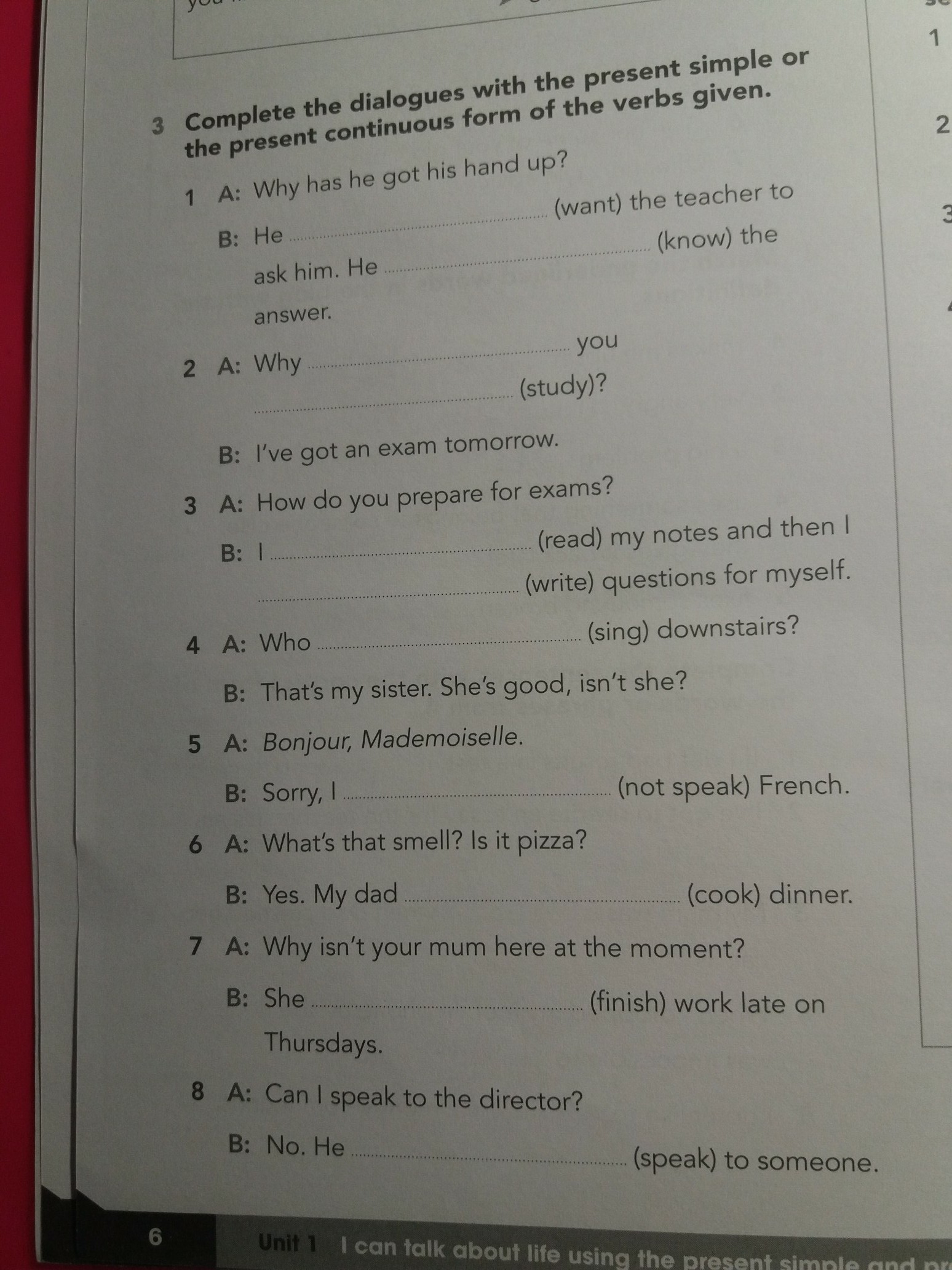 B: I'm reading my notes and then I'm writing questions for myself.