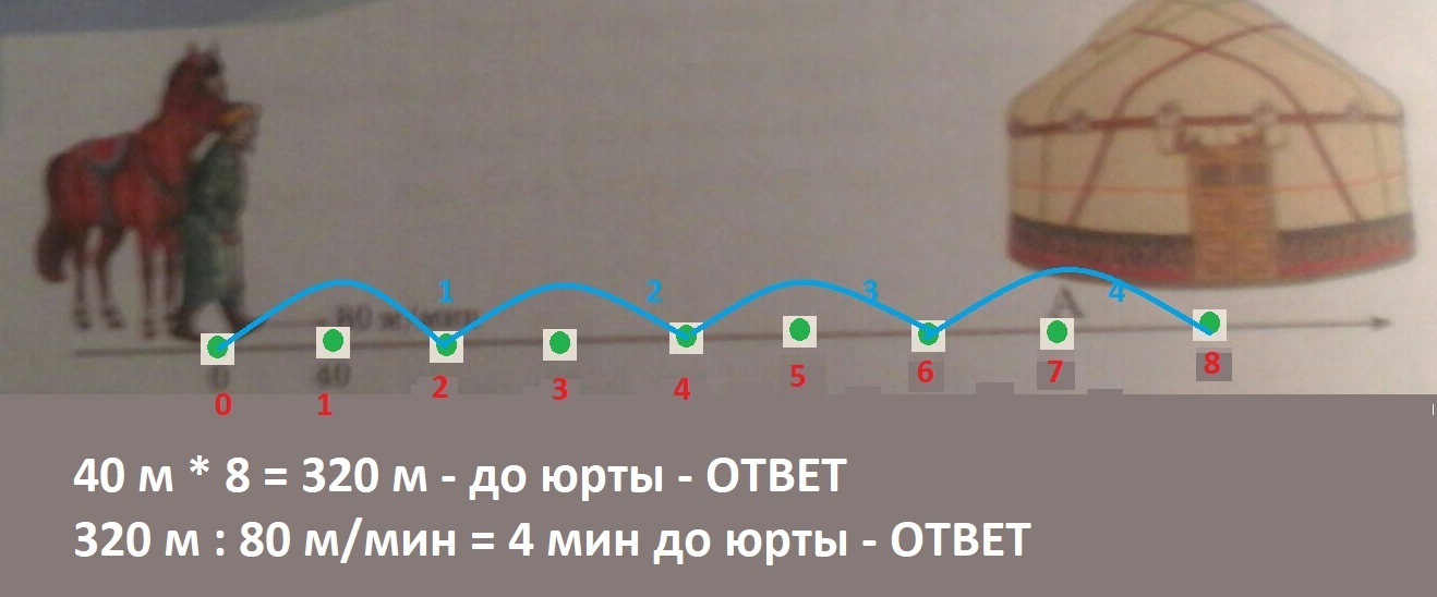 Алдар Косе илет к юрте Щыгайбая со скоростью 80м/мин. На координатном лучше юрте Шыгайбая соответствует точка А. Длина.еденичного отрезка равна 40 м.