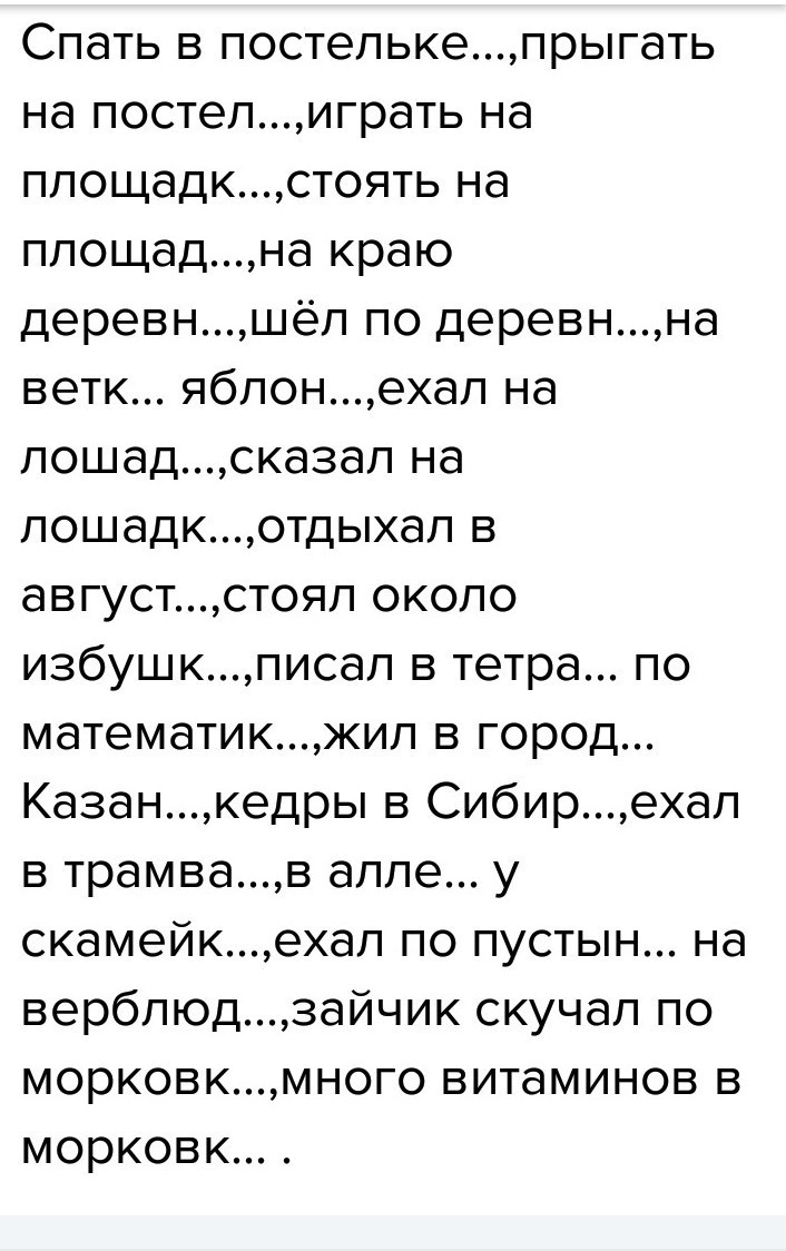 Спать в постельке, прыгать на постелИ(3скл, П.п.), играть на площадкЕ(1 скл, П.п.), стоять на площадИ(3скл, П.п), на краю деревнИ(1 скл, Р.п.), шёл по деревнЕ(1 скл, Д.п.), на веткЕ(1 скл, П.п.) яблонИ(1 скл, Р.п.), ехал на лошадИ(3 скл, П.п.), сказал на лошадкЕ(1 скл, П.п.), отдыхал в августЕ(2 скл, П.п.), стоял около избушкИ(1 скл, Р.п.), писал в тетрадИ(3 скл, П.п.), по математикЕ(1 скл, Д.п.), жил в городЕ(2 скл, П.п.) КазанИ(3 скл, П.п.), кедры в СибирИ(3 скл, П.п.), ехал в трамваЕ( 2 скл, П.п.), в аллеЕ(1 скл, П.п.) у скамейкИ( 1 скл, Р.п.), ехал по пустынЕ( 1 скл, Д.п.) на верблюдЕ( 2 скл, П.п.), зайчик скучал по морковкЕ(3 скл, Д.п.), много витаминов в морковкЕ(3 скл, П.п.).