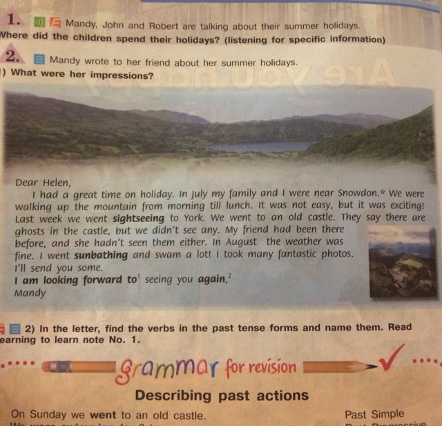 Дорогая Хелен, я отлично провела время в отпуске. В июле моя семья и я были рядом с Сноудоном. мы ходили по горам с утра до обеда. Это было нелегко, но это было захватывающе. На прошлой неделе мы отправились на экскурсию в Йорк. мы пошли в старый замок. Говорят, в замке есть призраки, но мы их не видели. Мой друг был там раньше, и она тоже их не видела. В августе погода была прекрасная. Я позагорал и много плавал! Я сделал много фантастических фотографий. Я пришлю вам кое-кого, я с нетерпением жду встречи с вами,