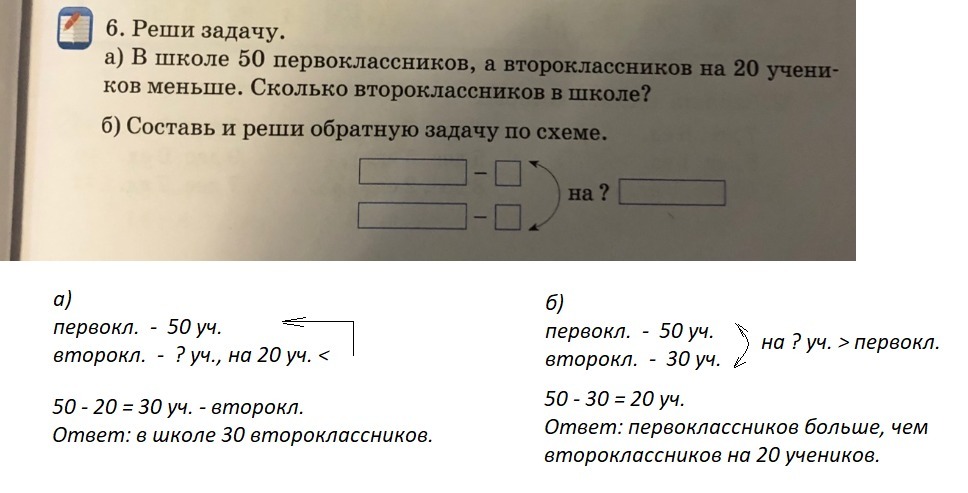 В школе было 50 учеников первоклассников и 30 учеников второклассников. На сколько больше в школе первоклассников, чем второклассников?